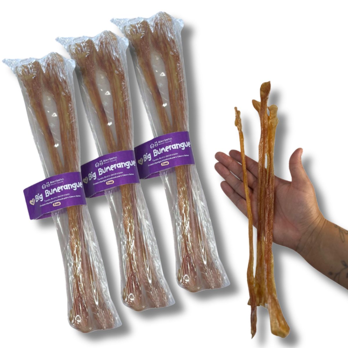 03 Pacotes de Tendão Bovino Desidratado Mordedor 100% Natural Para Cães Big Bumerangue AlecrimPet