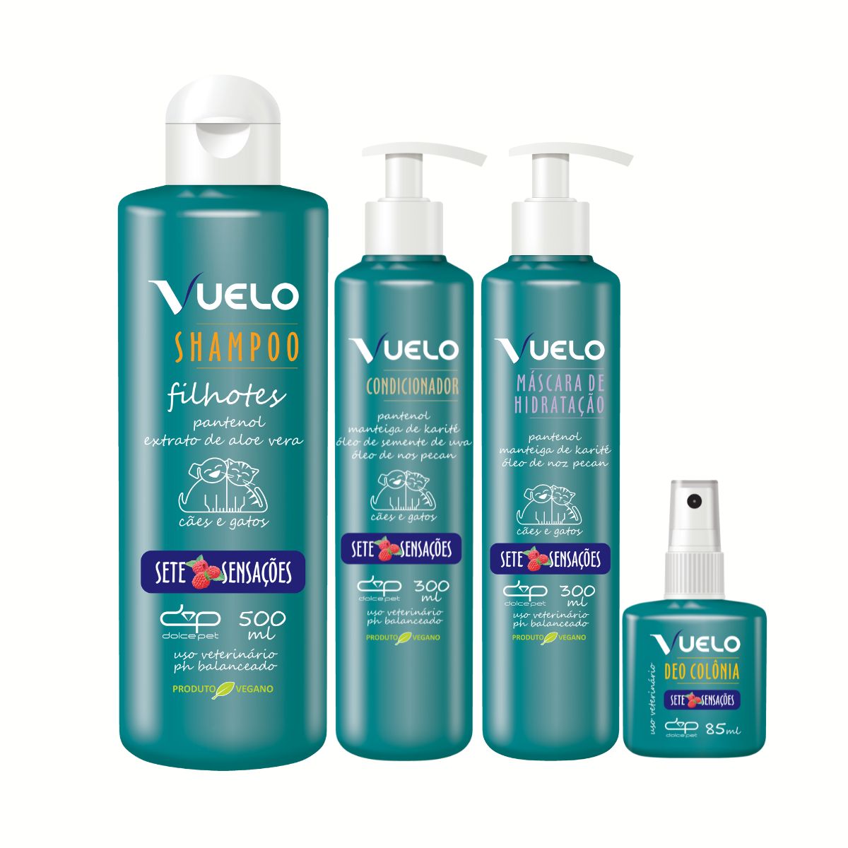 Kit Shampoo Filhotes Condicionador Máscara de Hidratação e Perfume Sete Sensações Vuelo Dolce Pet Cães e Gatos